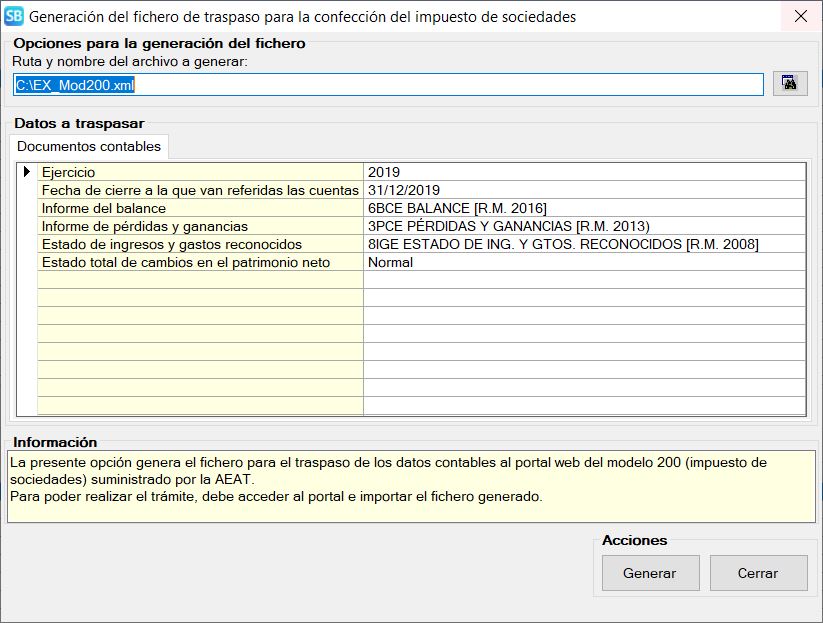 • Se incluye el módulo de enlace de la información contable (balance de situación, cuenta de pérdidas y ganancias y estado de cambios en el patrimonio neto) entre SBConta.NET y el portal web de la Agencia tributaria para el cálculo y presentación del impuesto de sociedades para el ejercicio 2024.