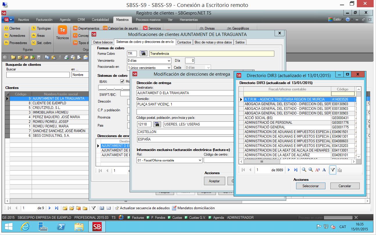 • El mantenimiento de las direcciones de envío de facturas de los diversos clientes se amplía con el objetivo de poder informar los códigos DIR3 (código único de cada entidad de la Administración Pública) de la oficina contable, órgano gestor y unidad tramitadora de la factura-