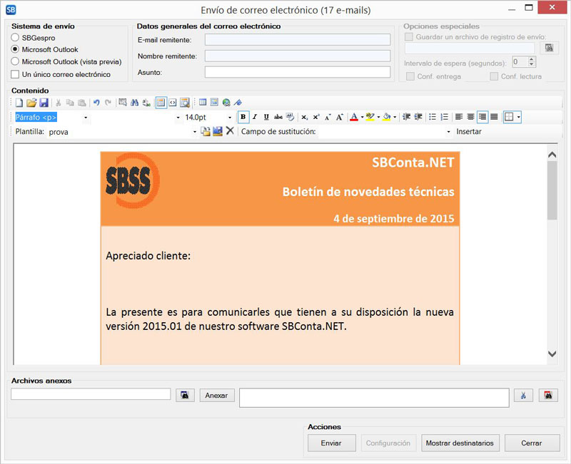Potente módulo CRM con el que podrá comunicarse con sus clientes y/o contactos por correo electrónico, bien sea utilizando MS Outlook o el método propio de envío de correo electrónico de SBGespro.NET.